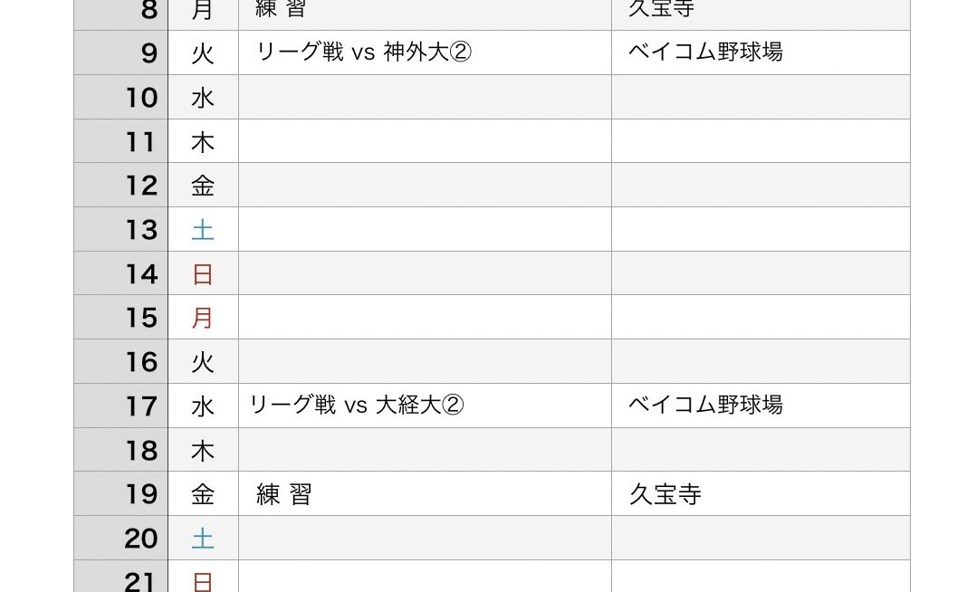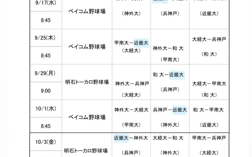 2025年 試合延期のお知らせ 9月5日(金)に予定されていた神戸市外国語大学との試合は、雨天のため延期となり、9月9日(火)にベイコム野球場で開催されます。これに伴い、リーグ戦の日程もすべて変更となりました。最新のリーグ戦日程表(スケジュール>2025年)をご確認くださ... 2025.09.04 2025年スケジュール
